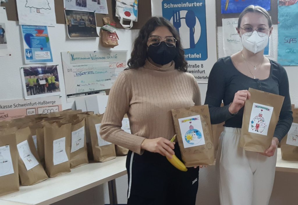 Auch in diesem Jahr packten Schülerinnen der WSR Tüten für die Kindertafel in Schweinfurt. Um die Brotzeittüten wieder mit schönen Weihnachtsmotiven zu verschönern, hatten die Schülerinnen und Schüler die Möglichkeit, ein Weihnachtskugelausmalbild kreativ zu gestalten. Die besten Ergebnisse wurden vervielfältigt und auf die Tüten geklebt. Anschließend packten Lena und Elina aus der Klasse 10c in jede Weihnachtstüte eine faire Banane, die von der Fairtrade-AG der Schule spendiert wurde.