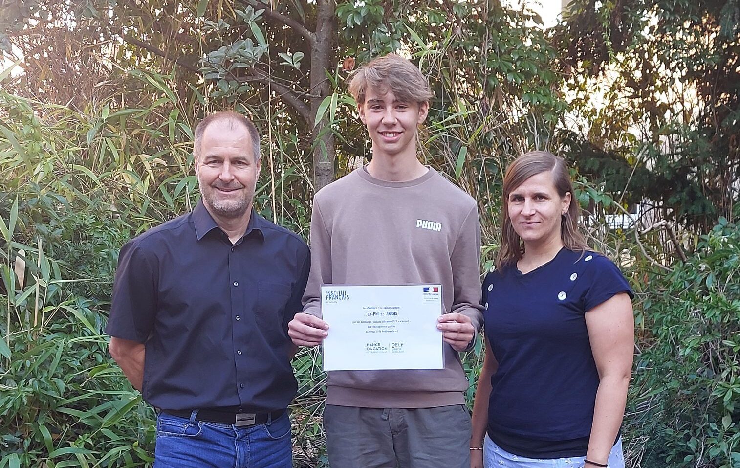 Jan-Philipp Leuchs von der Wilhelm-Sattler-Realschule hat in der DELF A2 Prüfung bayernweit eines der besten Ergebnisse erreicht und wurde dafür vom Institut Français in München mit einer Ehrenurkunde belohnt. Der Neuntklässler aus der diesjährigen Talentklasse, in der Französisch als zusätzliches fünftes Fach der Realschulabschlussprüfung absolviert wird, erlangte 98 von 100 Punkten. Das weltweit anerkannte DELF-Sprachdiplom kann an bayerischen Realschulen in der neunten und zehnten Klasse auf den Niveaustufen A2 und B1 erworben werden und beinhaltet neben einer mündlichen Prüfung ein Hörverstehen, ein Leseverstehen und eine Textproduktion. Unsere Schule gratuliert Jan-Philipp Leuchs aus der 9a hiermit noch einmal ganz herzlich zu diesem Erfolg.