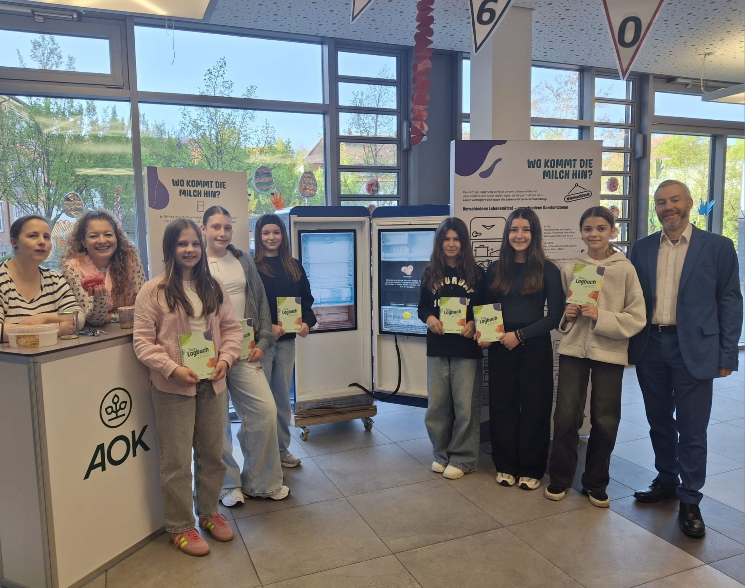 Alltagskompetenzenprojektwoche beschäftigten sie sich intensiv mit Themen rund um Nachhaltigkeit und Gesundheit – und das nicht nur theoretisch. Im Mittelpunkt stand die sogenannte NachhaltICHkeitsarena der AOK, die den Kindern und Jugendlichen auf interaktive Weise das Thema Nachhaltigkeit näher brachte. Ziel der Arena ist es, Schülerinnen und Schüler frühzeitig für nachhaltiges Handeln und Gesundheitsförderung zu sensibilisieren. Gleichzeitig vermittelt sie praxisnahes Wissen, das sich direkt in den Alltag integrieren lässt. In insgesamt sechs Modulen setzten sich die Jugendlichen mit zentralen Themen auseinander: der CO₂-Bilanz von Lebensmitteln, richtiger Lagerung, Lebensmittelverschwendung, bewusstem Einkaufen, Mikroplastik sowie aktiver Mobilität.